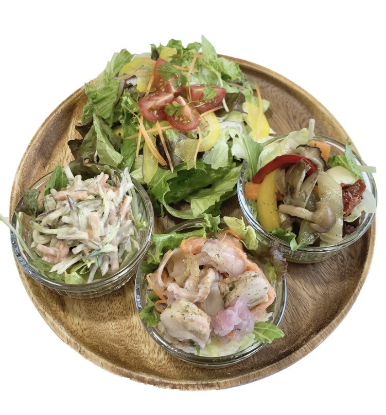 ホタテとサーモンの生ハムマリネ、繊維たっぷりなごぼうサラダ、オリジナルピクルス、リーフサラダのお得なセットです😌